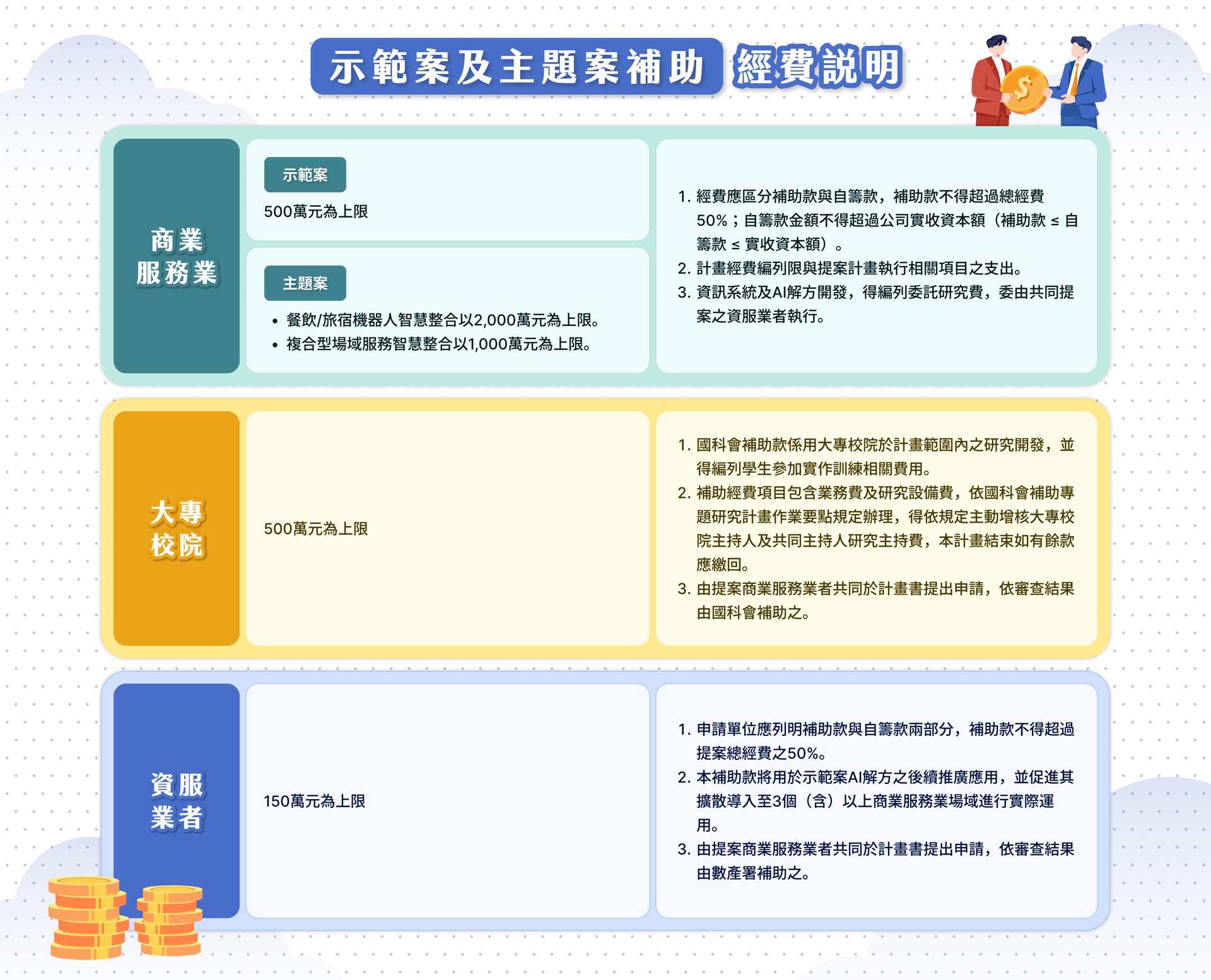 「大南方新矽谷推動方案」115年度智慧雨林產業創生計畫-智慧商業服務領域示範案及主題案申請須知:https://www.moea.gov.tw/Mns/populace/news/News.aspx?kind=2&menu_id=41&news_id=121259