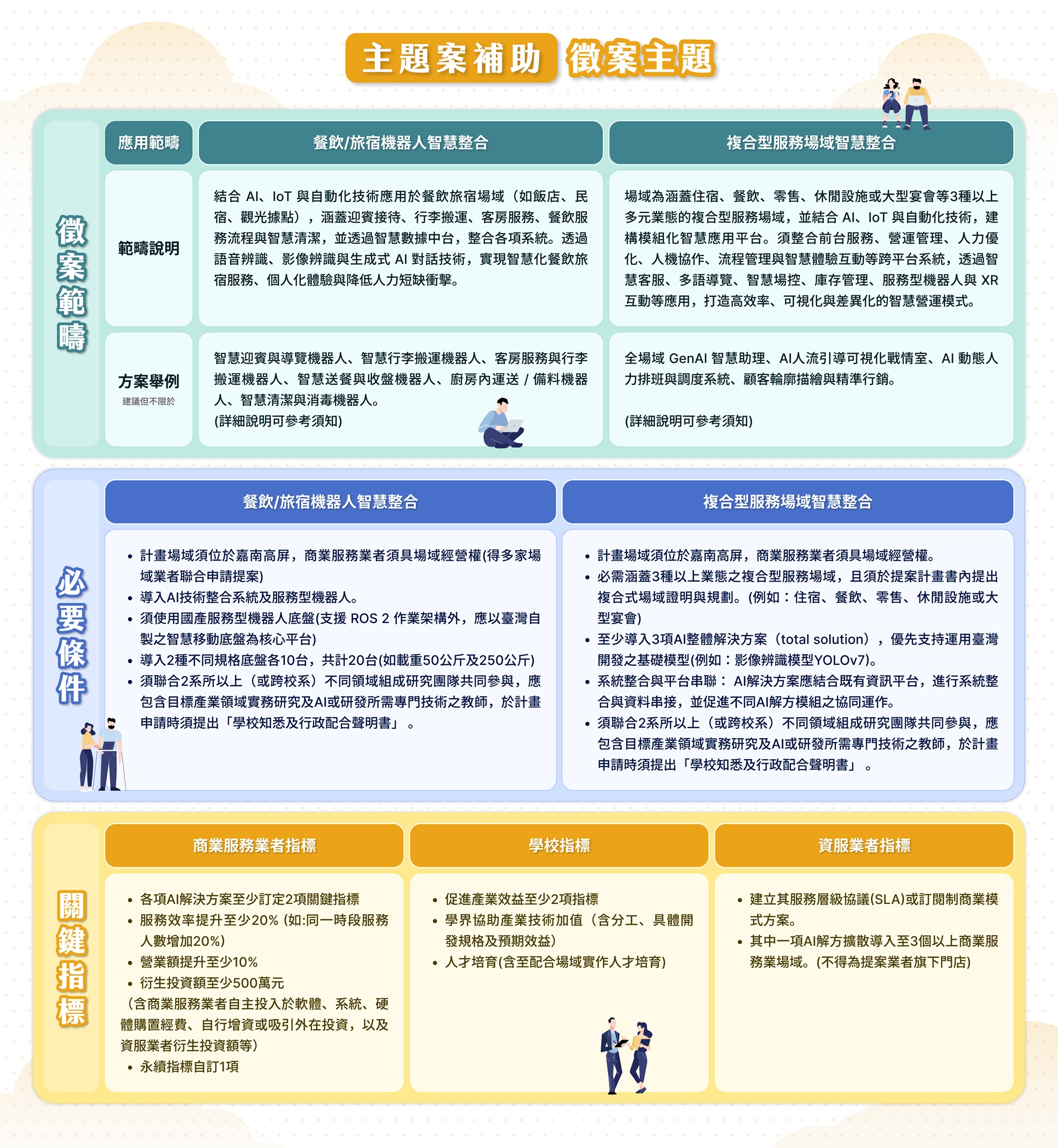 本計畫由商業服務業者及大專校院聯合資服業者三方協作共同提案,並以商業服務業者為主要提案者,且計畫場域應位於嘉義、臺南、高雄、屏東。